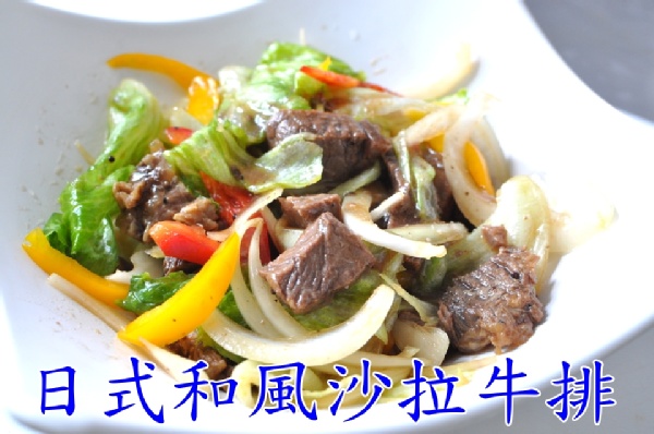 賣一些新鮮愛吃的生菜+中式燉滷全熟的牛排切小塊+日式和風醬