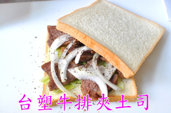 台塑無骨牛排加熱後切薄片+生菜+蛋或起司片+淋上一些香濃滷汁+土司