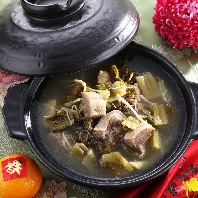 用麻油炒香客家酸菜(這是整株芥菜經天然日曬,再以一層芥菜一層粗鹽交疊,經7天重壓醃製,風味鹹酸香,全程手工製作,不添加防腐劑及人工色素)和薑絲、調味料,加入細火慢燉90分鐘的鴨骨高湯,和鴨肉塊再煮60分鐘,湯頭味道鮮美甘甜,鹹酸恰到好處,清爽又不油膩。