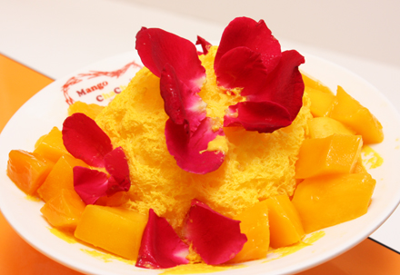 讓女生一看到就尖叫、男生看了吃驚的一道冰品!除了原本的芒果雪花冰之外,再加入淡雅的玫瑰香氣融合芒果味,再搭配上新鮮芒果,而冰品上面的花瓣不只是裝飾喔!有機新鮮玫瑰花瓣~真的可以吃喔!