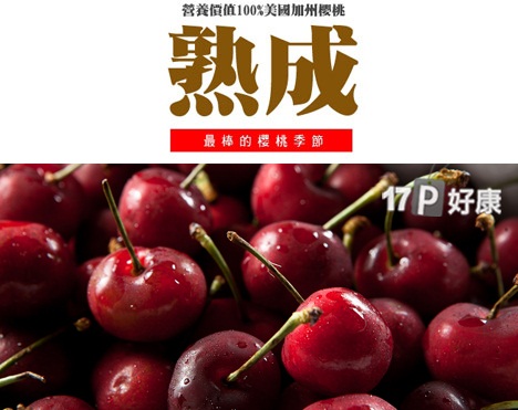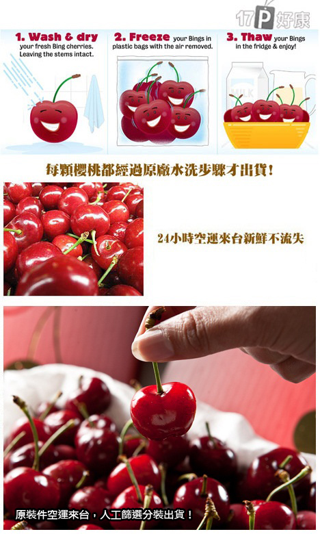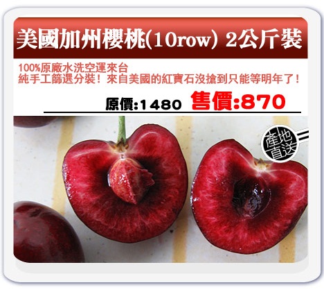 「來自美國加州的紅寶石」:美國加州當季櫻桃,在極佳的地理位置與環境孕育而成,香甜多汁,是全世界都喜愛的熱銷水果!肥沃的土壤與溫暖的陽光,加上歷史累積的栽種與包裝技術,讓每一顆珍貴的加州櫻桃,都能在24小時內經過專業的人工採摘→清洗→包裝完成!其中的人工採收過程還必須避開陽光,於凌晨或日光較弱的早晨摘取!更由於其嬌貴的特性與短暫的供應季節,大多數新鮮櫻桃皆以空運方式進口,再經過人工篩選,將壞爛的挑除之後分裝出貨,讓消費者享受最高品質,一飽口福!