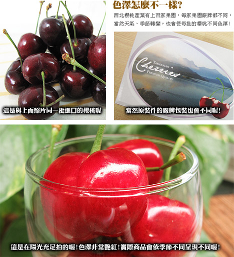 加州櫻桃產業有上百家果園,每家果園廠牌都不同,當然天氣、季節轉變,也會使每批的櫻桃不同色澤!加上拍照光澤與每部電腦螢幕呈現不同顏色,但本檔保證是當季櫻桃請放心!