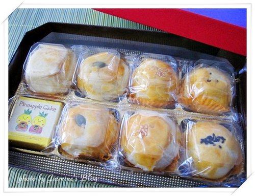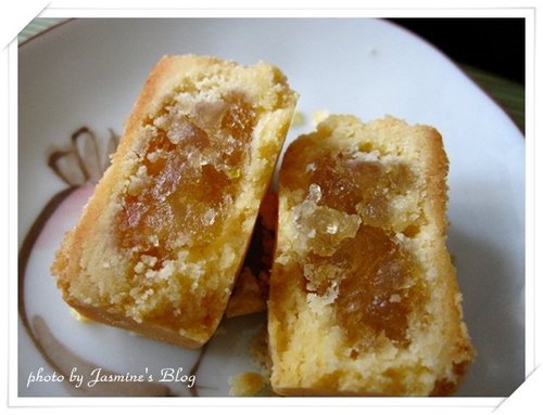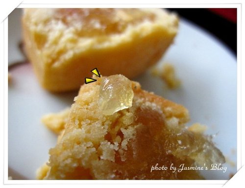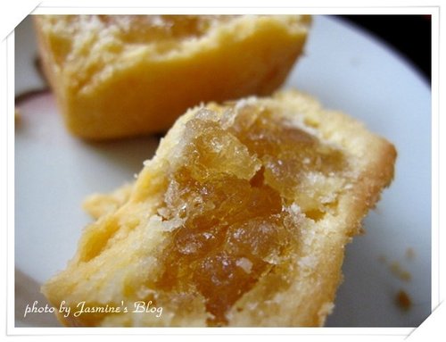 烤的金黃美麗的鳳梨酥,永遠是這麼迷人,讓人連目光都捨不得移開,在金黃斑的鳳梨內餡裡隱約能看見椰果的存在。