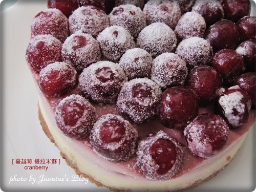 一顆顆嬌豔欲滴的紅寶石–新鮮蔓越莓果實,鋪滿整個蛋糕;
