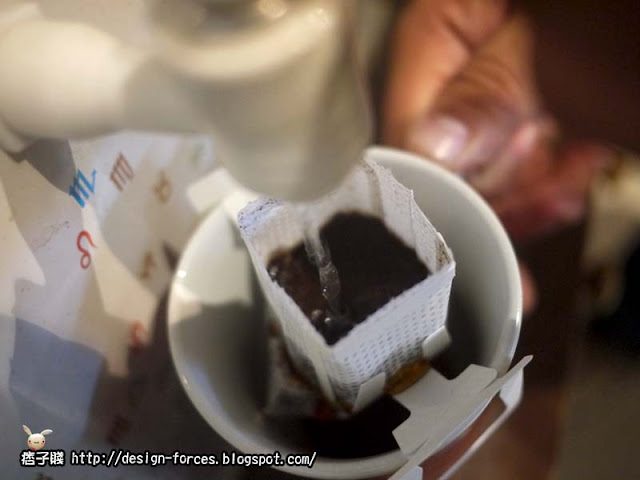 沖泡咖啡前,要先找一個杯身高點的杯子,再打開過濾式的咖啡包!打開時,賤賤覺得咖啡的香味真的很讚,連旁邊的人都被香味吸引住!