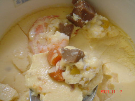 ↓把蒸蛋底下的料撈出來,有杏鮑菇、紅蘿蔔、玉米,以及我額外添加的蝦仁