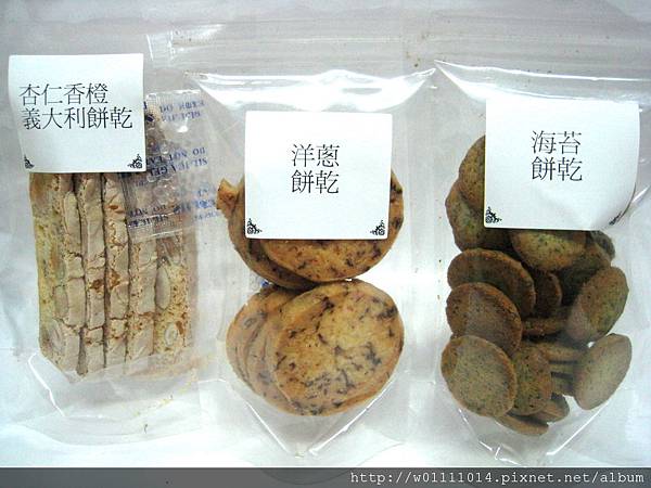 產品是:巧克力牛奶糖、巧克力棉花糖、洋蔥餅乾、海苔餅乾、杏仁香橙義大利餅乾