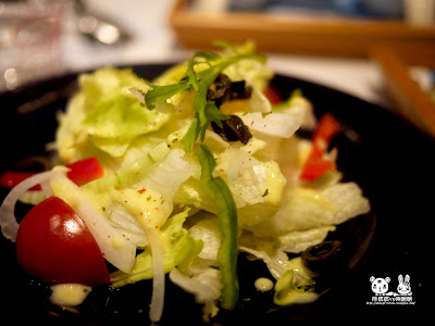 這是兔眠眠點的三種前菜,熊痞痞只對中間那個有印象,吃起來酸酸的,但很好吃,最後索性拿這邊的醬來配我的沙拉吃。