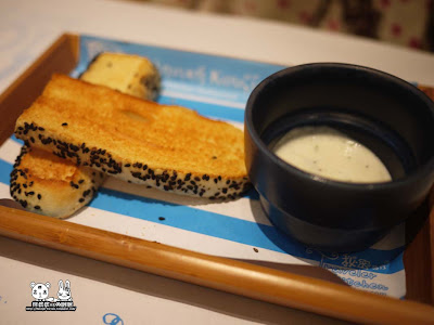 這是【餐前麵包+黃瓜優格醬(塔查吉基)】,麵包烤得不錯,脆脆的口感搭配酸酸的希臘優格醬很棒,只可惜麵包有點冷掉,如果是熱的會更好。