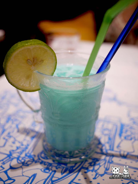 這是夢幻藍白,已經被熊攪拌過了,一開始是有兩層顏色的,看起來很漂亮,還有檸檬片裝飾,屬於氣泡飲料。