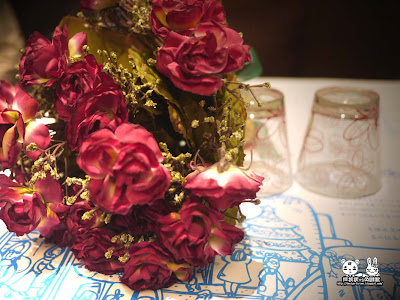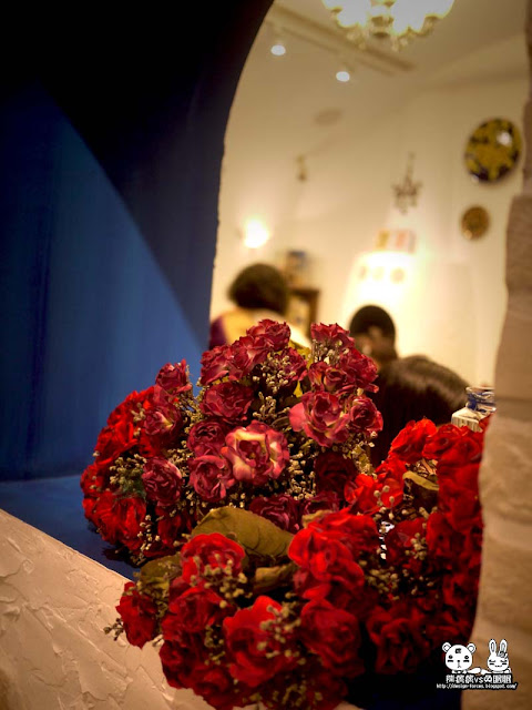更讓熊痞痞覺得貼心的是,在用餐的座位上,希臘的女神還偷偷放上紅玫瑰花束,當兔眠眠坐下時,立刻露出不可思議的表情,並質疑的問我:這是??...((其實這是來自希臘的愛情玫瑰,獻給可愛的兔眠眠啦~~偷偷閃一下,哈哈,不過這玫瑰真的有點大,對於吃飯時候很礙眼...所以後面就叫"波瑟芬"女神拿走了XD)
