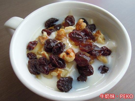 冰了一個晚上,放上核桃、葡萄乾,在淋上蜂蜜,就把優格當成早餐,DIY的優格綿密細緻,也不會過酸。