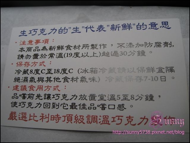 在盒子裡有一張小卡細心提醒生巧克力的保存方式