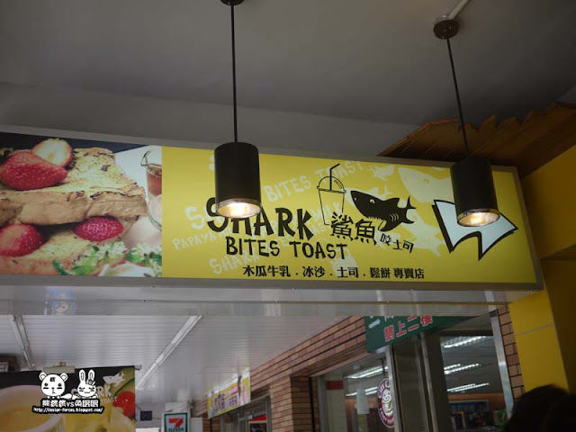 禮拜六兔眠眠一下課,熊就騎車機車載兔呆一起去吃,這家店的名字很特別,叫做鯊魚咬吐司,位置蠻好認的,就在7-11與麥當當附近,不過熊是路癡....一開始沒注意到這家店的正確位置在哪,是剛好有一位小姐在停車,差點把別人的車子弄倒,熊只好先停下來去幫忙,沒想到誤打正撞....竟然停在店門口附近,算是好心有好報麻XD。