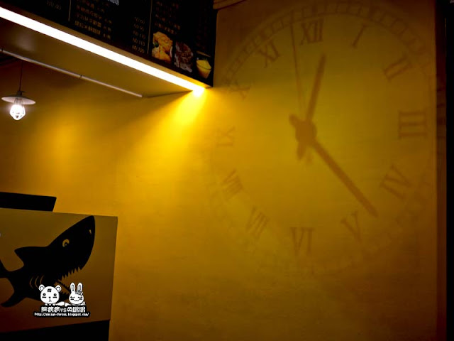 吃到一半時,才發現牆壁上有一個投影的時鐘,蠻特別的,整體吃下來的感覺很讚,兩個人搭配飲料與餐點,大概加起來的價位在400左右,是一家值得再去一次的店,但說真的....排隊真的排很久...來的時候建議要預約唷,不然就要跟【熊痞痞VS兔眠眠】一起去隔壁的7-11報到囉~~哈哈!