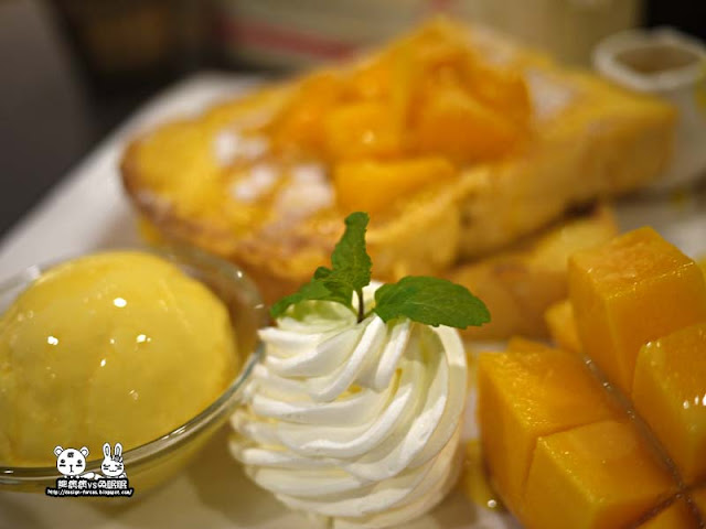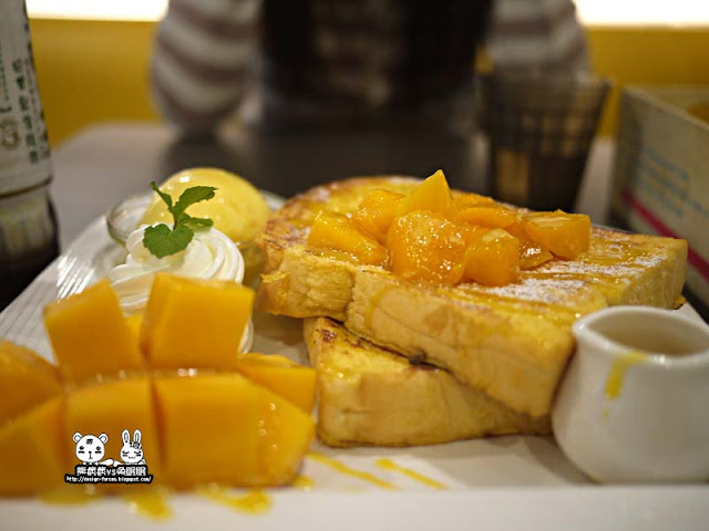 熊點的是芒果布丁吐司!兔呆說:「布丁吐司的感覺有點像是法國吐司,表面沾了蛋汁下去煎,上面灑上糖粉與芒果醬,最後在加上切丁的芒果就完成囉,其實在家裡也可以自己DIY的。」