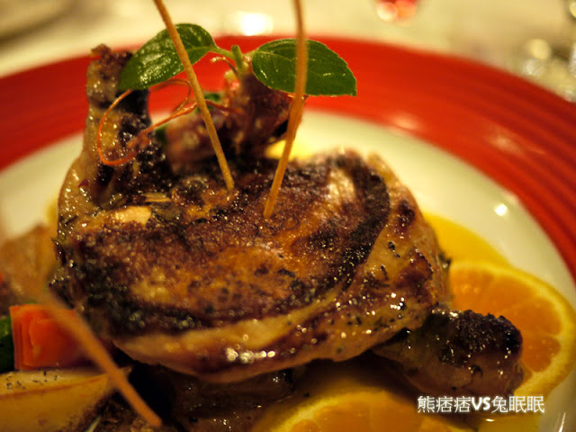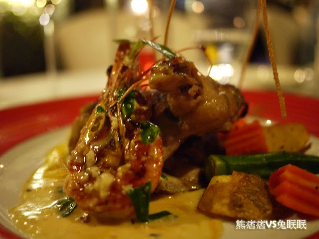 這是今天的主餐,迷迭香烘烤法式半雞佐檸橙醬+香蒜奶油海大蝦,擺盤上很有意思,竟然把雞腿上插上兩根鬚鬚,這是要進化成雞腿龍蝦的意味嗎XD?