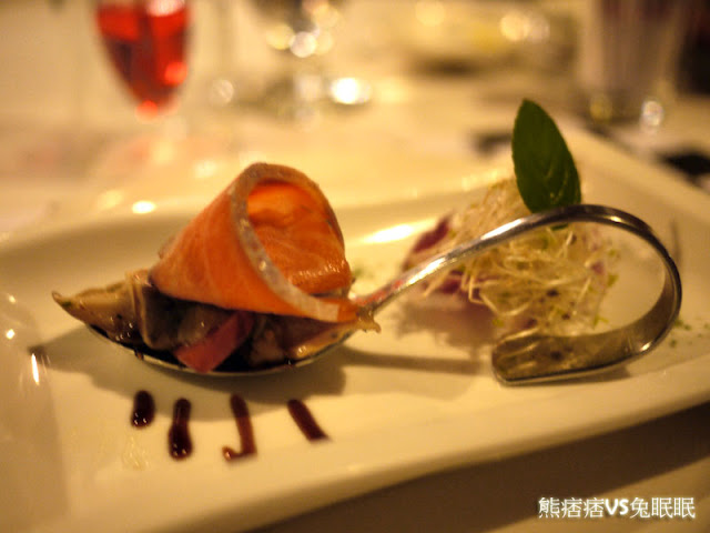 第二道是煙燻鮭魚佐檸橙醬,這一道就讓我覺得好正點,坦白說我不吃跟生魚片相關的東西,因為我不喜歡芥茉的味,像大多數的生魚片都要搭芥茉吃,這個卻意外是用煙燻佐檸橙醬去搭配,肉質很嫩,有些淡淡的鮭魚味,底層則是搭配菇類來享用,還蠻喜歡這道的。