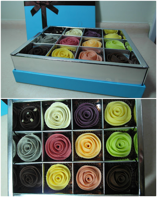 打開禮盒後,十二朵的繽紛玫瑰花映入眼簾!各種顏色有著不同的口味,紅- 覆盆子蔓越莓、紫- 藍莓黑醋栗、橘- 哈密瓜、白- 香草香蕉、綠- 青蘋果、黃- 鳳梨柑橘、黑- 櫻桃白蘭地、深咖啡- 榛果杏仁、粉紅- 草莓芭樂、土黃- 百香芒果、灰- 芝麻、淺咖啡- 鹽味牛奶,多到不知道該從何下手XD