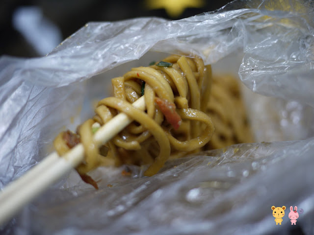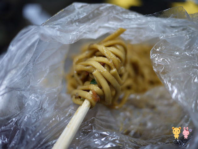 這邊的炒麵是用袋子裝的,弄好後會先把炒麵丟給我們,先讓我們加上自己想要的醬料。