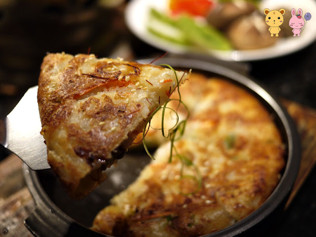 另外還加點了海鮮煎餅,不過這個比較麻煩,因為是現做的,要等快30分鐘才會好,建議在一開始就要加點了!煎餅雖然看起來很厚,但並不是想像中那種硬硬的,而是外酥內軟的口感,還吃得到蝦子那些,搭配醬料下去蠻對味的,好吃!
