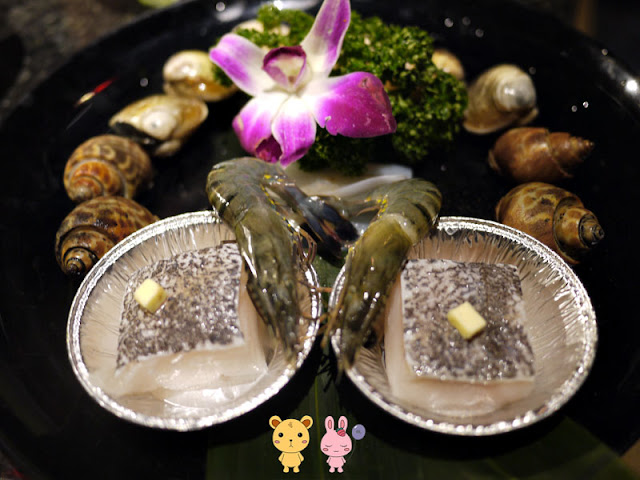 第三盤是綜合海鮮,情人套餐的擺盤很有巧思,還把蝦子弄成愛心樣,真是可愛!裡面的海鮮最讓我印象深刻的是圓鱈,厚度有!所以烤到一半時,服務生會過來幫忙翻圓鱈,肉質吃起來很嫩,由於那時有把蛤蠣加進去一起烤,整個湯頭很鮮甜,好喝。