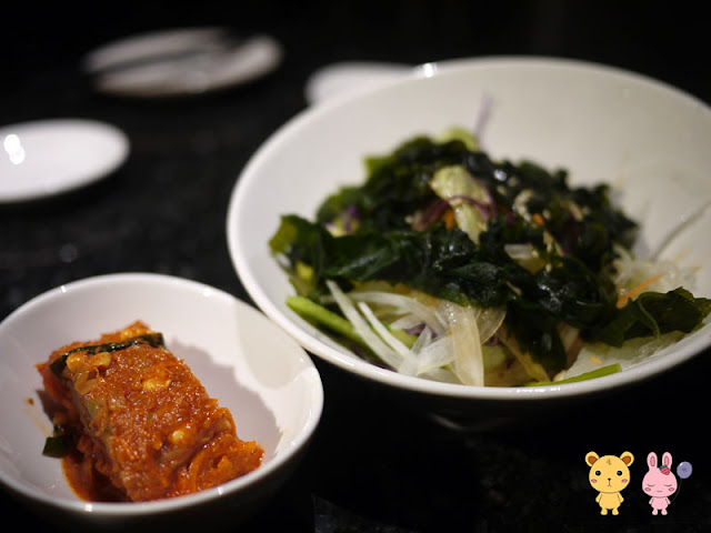 套餐部分的第一道菜,是海帶沙拉跟泡菜(兩人分),沙拉的部分比較清爽,普通沒什麼特別之處,泡菜的味道則很讚,會讓人想一口接著一口的去吃,。