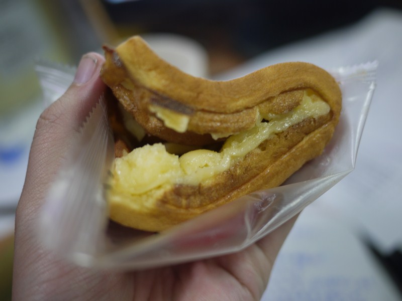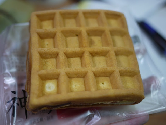 而且最讓我訝異的是,他的外皮好軟,稍微彎曲一下還不會斷耶,超好玩的!味道上有點像是再吃銅鑼燒的感覺?不知道是不是我的錯覺...這跟小時後吃到的銅鑼燒有點相似。