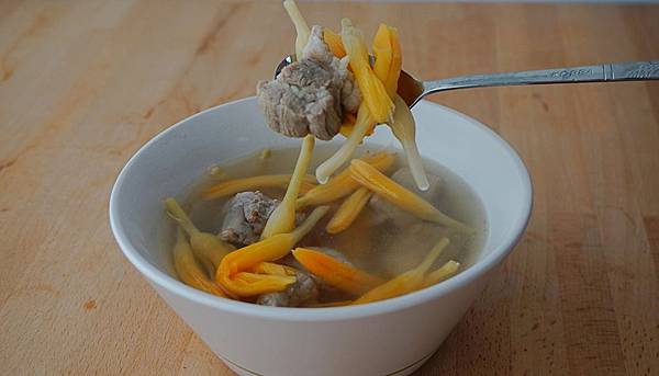 金針排骨湯,黃澄澄的金針襯托著紅潤的排骨肉