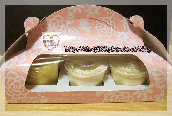 這粉紅色的禮盒共有三種產品,手工烤布丁、原味奶酪和蘋果奶酪三種