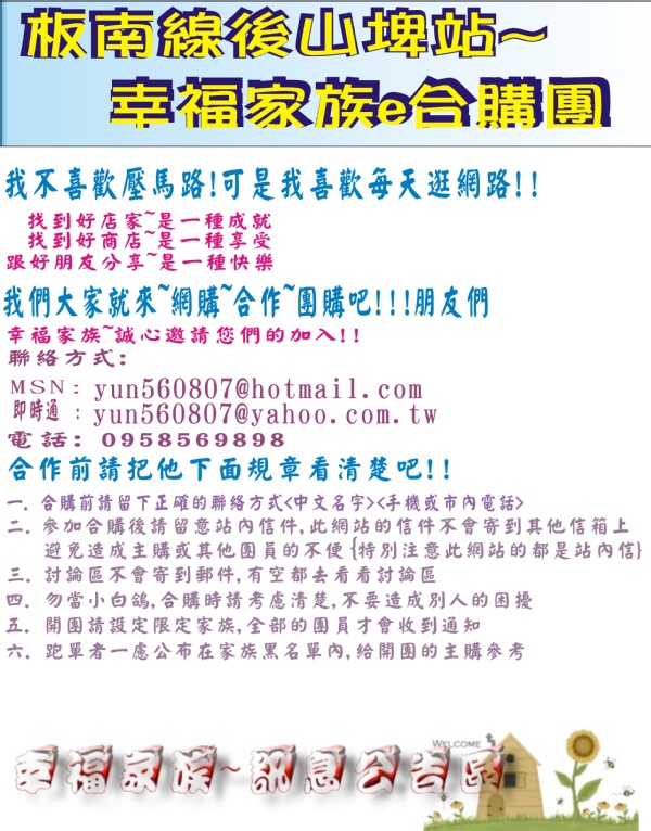 關於家族 看更多 收起 家族合購 搜尋 我要開團 周峯辰 (103) 合購已截止 2024 錚女王聯名款2.0版 黑科技智能腰帶 統計: 0 人 0 份 0 元 面交: [台北市][信義區] 捷運板南線永春捷運站2號出口 周峯辰 (103) 合購已截止 2024 錚女王聯名款2.0版 黑科技智能腰帶 統計: 0 人 0 份 0 元 面交: [台北市][信義區] 捷運板南線永春捷運站2號出口 周峯辰 (103) 合購已截止 錚女王聯名款 EMS微電流黑科技塑身腰帶+贈專屬充電頭! 統計: 0 人 0 份 0 元 面交: [台北市][信義區] 捷運板南線永春捷運站2號出口 周峯辰 (103) 合購已截止 越南 BaTu帶膜薄鹽腰果(400g/瓶),特價↘ 統計: 0 人 0 份 0 元 面交: [台北市][信義區] 捷運板南線永春捷運站2號出口 sincia (19) 合購已截止 已流團 - 法國秘密甜點彌月蛋糕NO.1-諾曼地牛奶蛋糕-徵25條免運! 統計: 2 人 4 份 996 元 面交: [台北市][中正區] 汀州路二段168號1樓(捷運古亭站2號出口旁) 看更多 家族討論 搜尋 發表文章 主題 作者 回覆 推 最新回應 幸福家族~優質商家~ a0933877015 (6) 2010/9/14 65 1 2014/3/23 幸福家族~試吃園地~ a0933877015 (6) 2010/7/29 26 0 2011/3/16 不錯的茶食 a0933877015 (6) 2010/12/15 0 0 幸福家族~活動花絮~ a0933877015 (6) 2009/5/14 1 0 2009/5/15 幸福家族~族規~ a0933877015 (6) 2009/5/14 1 0 2009/5/14 幸福家族~結團記錄~ a0933877015 (6) 2009/5/14 0 0 2009/5/14 (轉) 合購新手入門需知【互給評價 】 a0933877015 (6) 2010/9/12 386 768 2016/3/8 您好唷~為各為推薦真正耐用的各種好傘! umk8989 (229) 2015/1/23 0 0 Luminee 露明亮Q10抗氧化牙膏 (韓國原裝進口) KCM (0) 2014/7/16 0 0 Luminee 露明亮牙齒美白貼片 (韓國原裝進口) KCM (0) 2014/7/15 0 0 大家好~我是專賣浴室廚房貼~有需要可以來觀看依下 sa16348879 (50) 2014/6/9 0 0 NUMEN除臭/機能襪重新上線囉~合購優惠誠意看得到~回饋10%賺得到~ numen-wow (9) 2014/3/23 0 0 紅利金4%加倍送!倒數中★日本六冠王 促進新陳代謝、排便順暢 ohtahealth (72) 2014/3/12 0 0 禾侑食品(小當家海苔)泰式海苔殺很大,大特價哦! vivian911 (134) 2013/11/16 0 0 網路超夯 每22秒賣出一包 100%天然健康的桑葉茶 ohtahealth (72) 2013/11/15 0 0 一起來品嚐歐洲進口餅乾:比利時焦糖脆餅25片NT65 平安喜樂 (39) 2013/10/3 0 0 一堂大小朋友的自然課~ 大手拉小手認識無患子(果皂12元浪漫紗袋裝) 平安喜樂 (39) 2013/9/14 0 0 麻煩幫忙填問卷,可以抽隨身碟和禮卷 peggypan (27) 2013/9/1 0 0 五彩繽紛~~ piko19951129 (163) 2012/9/13 0 0 4.4星 新時代麵點 愛麵子 好評熱賣中^^ hwa9999 (240) 2012/9/13 0 0 看更多 許願商店 以下是家族成員近兩個月逛團購名店街時「許願」且主購尚未開團的商店, 若您想合購可以點選「許願」一起集氣來請主購開團! 目前沒有家族成員點選許願後還沒開團的商店,您可以前往團購名店街在想合購的商店中點選許願請主購開團喔!前往團購名店街 看更多 加入家族 家族面交點: 無設定面交點 家長: a0933877015 (6) syk8825 (1) 成員人數:984人 類 型:同好