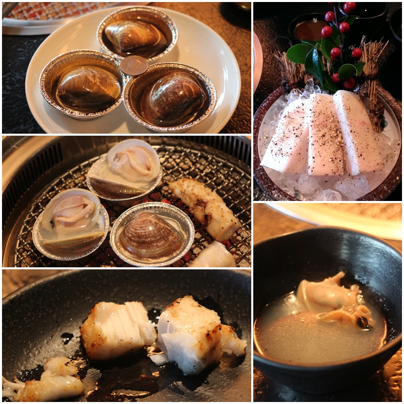 大蛤蠣(非常的大請看圖中十元硬幣比較,烤熟後肉質肥美、湯汁超鮮甜)、