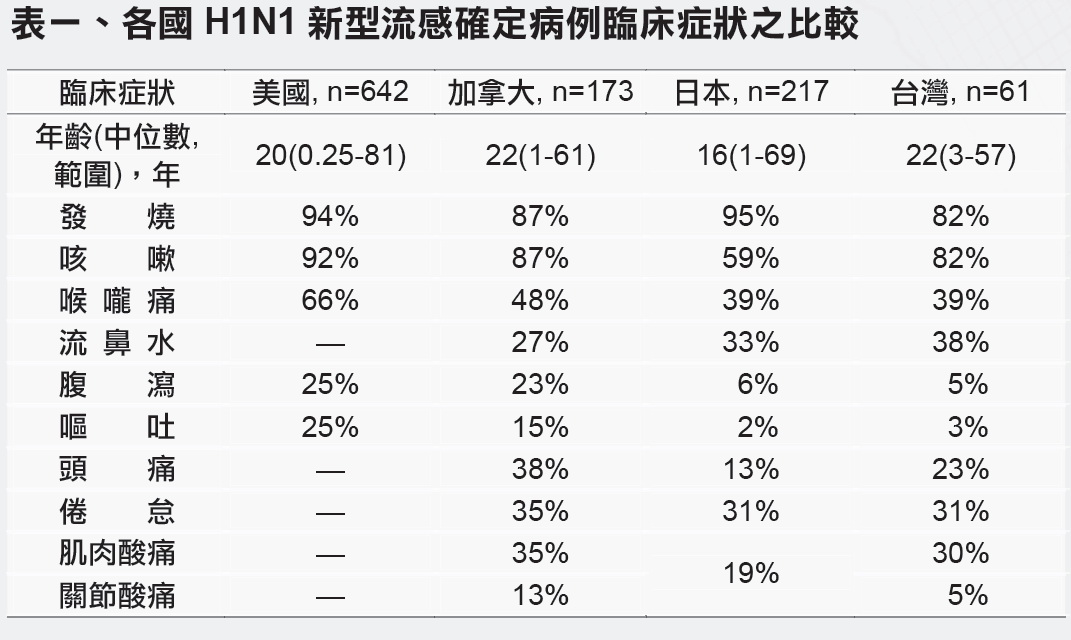 這個表是我們疾管局防疫醫師所整理的,各國H1N1新型流感確定病例臨床症狀之比較,出自台灣H1N1新型流感之因應暨最初61例確定病例之分析。台灣82%的病人