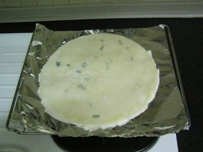 2.烤箱220度預熱5分鐘,此時取來烤箱架鋪上鋁箔紙,取來餅皮一片攤放在鋁箔紙上。