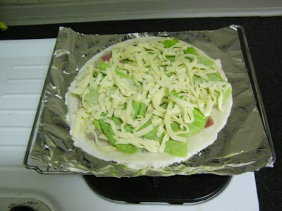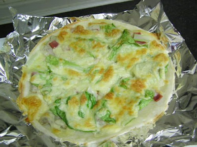 為了做這個焗烤,懶藍特地跑去買火腿跟乳酪絲,真的好貴喔!買了這兩樣東西以後,其實懶藍根本就不想買其他東西了,決定當個省錢的好孩子,把冰箱裡有的東西放上來就好,所以變成這麼Local的焗烤餅皮了,應該不能說他是披薩。