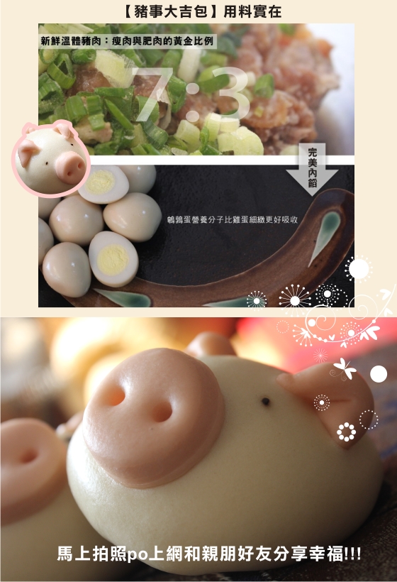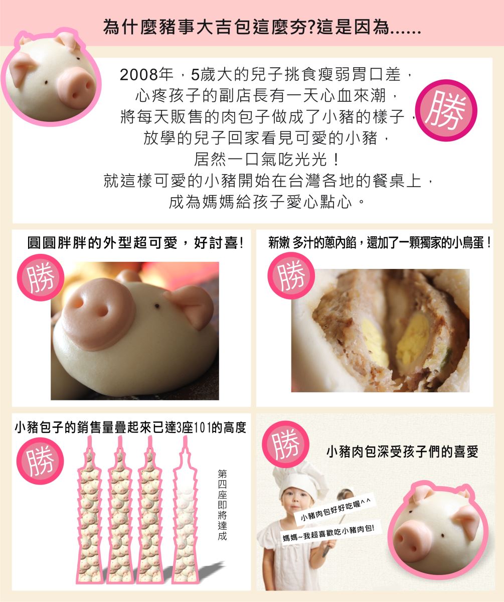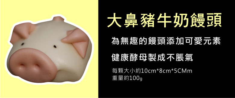 好吃又好玩,小朋友不挑嘴囉!可愛造型的包子,讓挑食的孩子,一口氣吃光光!紅麴鼻子,百分百添加牛乳,不添加色素、防腐劑,接單後新鮮生產製作,天天現做,口感更加分!可愛小豬圖案,健康酵母製成不脹氣,絕對讓您愛不釋口。
