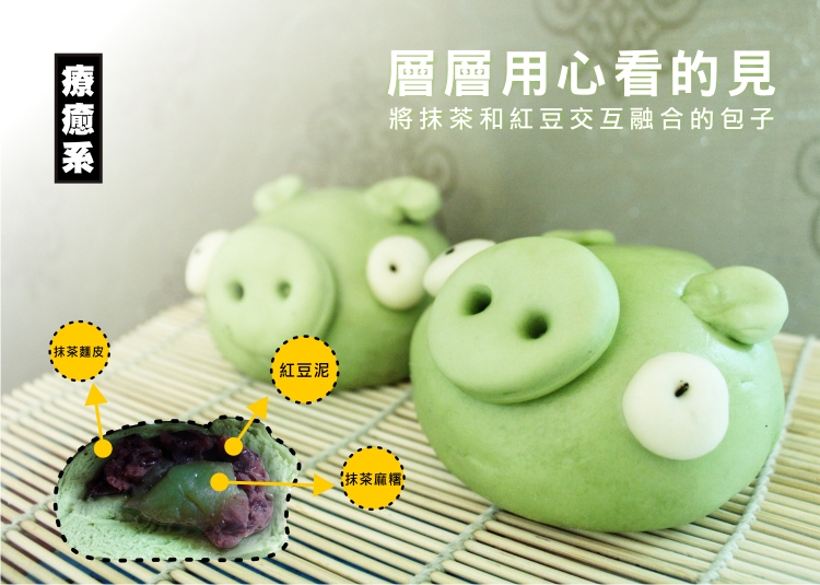 可愛的綠色豬頭,療癒造型100分!採用高級進口日本朝日抹茶粉製作,剛出爐的熱騰騰包子,清新茶香四溢,叫人無法抗拒!