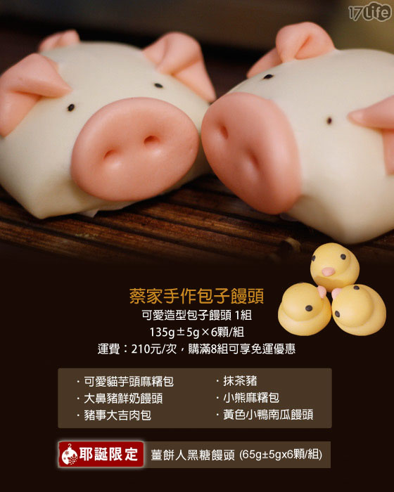 是這樣的啦..我想買蔡家包子(之前我們團過的,以造型取勝)目前節日限定款"薑餅人黑糖饅頭"和"黃色小鴨饅頭"啦!因為這幾款有的是限定款~愛合購上沒有放!所以一般來說買不到,只好自己上網買!也因為是節日限定,所以大概只有最近有啦(因為黃色小鴨跟即將來到的聖誕節咩)...我家兒子是"視覺系"動物!所以我才想上網購買嚐嚐鮮!如果家裡有一樣視覺系的的孩子的這應該很好騙