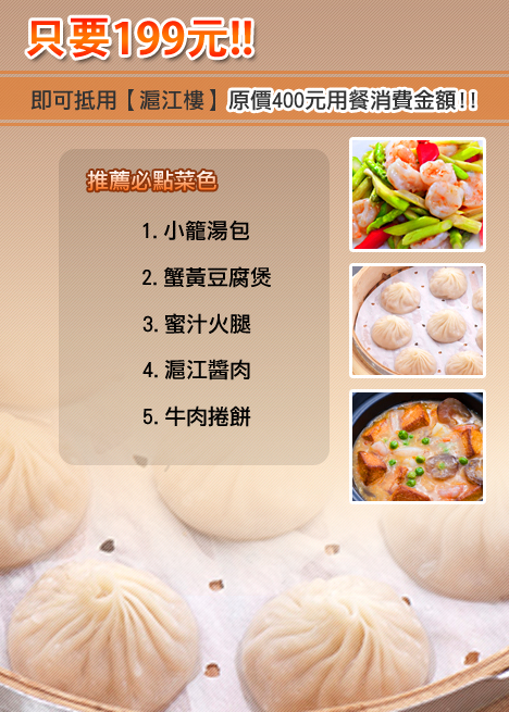 [優惠] 【桃園】好康:至6/8結束~只要199元即可抵用【滬江樓】原價400元用餐消費金額!