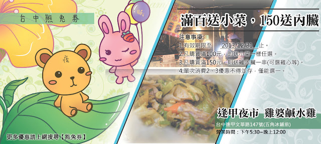 【台中熊兔券】逢甲夜市。雞婆鹹水雞優惠券,凡憑此券消費滿100元即送1樣蔬菜,滿150元則送內臟一串(原價20元,可選雞心等),若超過150元以上,僅能蔬菜或內臟則一,單次消費僅能兌換一次,有限期間至2013/12/31日止。