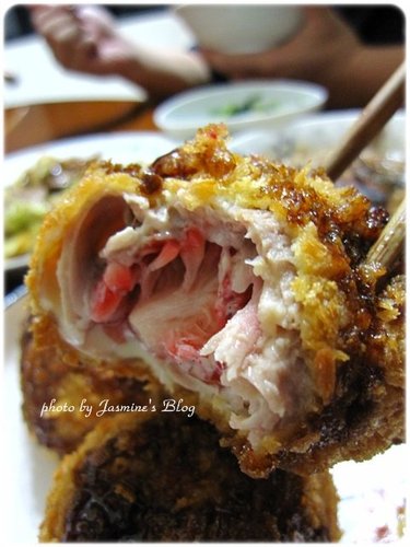 金黃飽滿的丸子,像極了裝滿草苺的福袋,點綴上草苺綠葉蒂頭,又像一顆金色大草莓,酥脆金黃的外衣,一口咬下卡滋卡滋,裡面的草莓微酸甜漿汁,與香濃起司三者融為一體,梅花肉片的油花也化為鮮甜肉汁,不乾不澀軟嫩滑口,不需多嚼就在嘴裡化開;沒有其他的調味,單靠食材本身的味道與淋在外層的照燒醬汁,味道就已足夠。就算單獨搭配火鍋,只要涮個2~3下,也能品嚐到簡單的鮮美甘甜滋味。