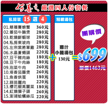 ●【何善之湯包館】好康憑證699元!2011/8/13前使用即可享有獨家優惠:抵用最高價值1,463元(1,330元+10%)的【何善之湯包館】四人份套餐:明星私房菜15選4+店內人氣第一首選雞汁湯包一籠!上次沒P到,這次絕對不能錯過!