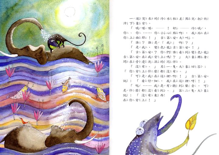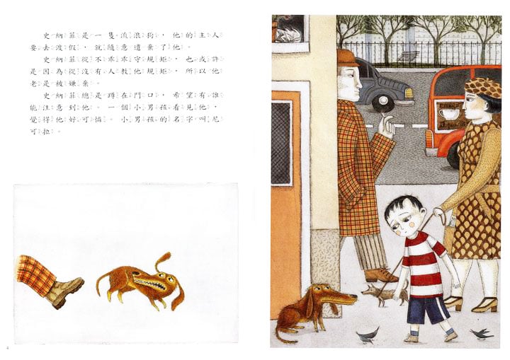 | 吉第安可是很厲害的變色龍哦!他的皮膚顏色會隨著環境的變化而自然改變,變得森林裡的動物都看不見他啦!就因為這樣,他沒有朋友,甚至連個跟他說「早安!」的人都沒有。 吉第安很沮喪!他決定離家出走,到一個找得到朋友的地方。誰知道離家計畫才進行了一半,就碰上飢腸轆轆的惡虎。吉第安的「隱身」能力,這個時候發揮了強大的作用,勇敢的變色龍吉第安成了守護森林的「無名英雄」…… | 回來了!向日葵咬著小野菊,興奮地等著他的主人捲捲毛進門來,想把花當作回家的歡迎禮送給他。然而,一如往常,捲捲毛端著科學家的冷漠和理智,淡淡地到了聲謝,隨即埋頭紀錄他的科學數據。向日葵依舊只能待在陽台上吹風淋雨…… 有一天,強風送來了一把鑰匙,向日葵靈敏的狗鼻子嗅出了奇蹟的味道。在這個魔法之夜,他終於可以走進捲捲毛的屋子裡,用他的熱情和愛,融化主人冰冷的心 …… | 住在大城鎮的水泥高樓當中,羅羅快要悶壞了,從他家望出去,看不見一絲大自然的影子。幸好爺爺寄來的風箏救了他,他決定爬上五十九個階梯,到頂樓上去和大自然玩耍。大自然果然神奇,不但趕走羅羅心頭的烏雲,也治好了管理員太太的頭疼和感冒,更讓城市人的冷漠無情消失…… | 流浪狗史納菲終於遇到了一個好主人──小男孩尼可拉,可是他沒有遵守約定,不停地搗蛋,終於被尼可拉的媽媽送到流浪動物之家! 尼可拉好難過,但是他不能不管史納菲,所以他偷偷救出史納菲,帶著他在街上閒蕩。史納菲決心贏回尼可拉的信任,於是他展開一連串的「好狗狗行動」,最後居然變成了小鎮英雄…… |