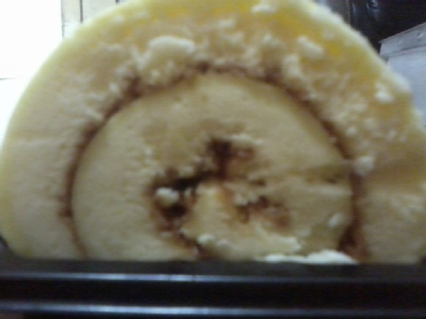 接下來就是重頭戲了~打開塑膠盒仔細觀察這款瑞士捲蛋糕的色香味,從這剖面突來看是不是讓大家都已經開始留下口水啦,蛋糕的近照,中間夾層是淡淡的焦糖,而他的蛋糕綿密鬆軟,放入口中雖不到入口即化這麼誇張,但是很好吃卻是對這款蛋糕很中肯的評論