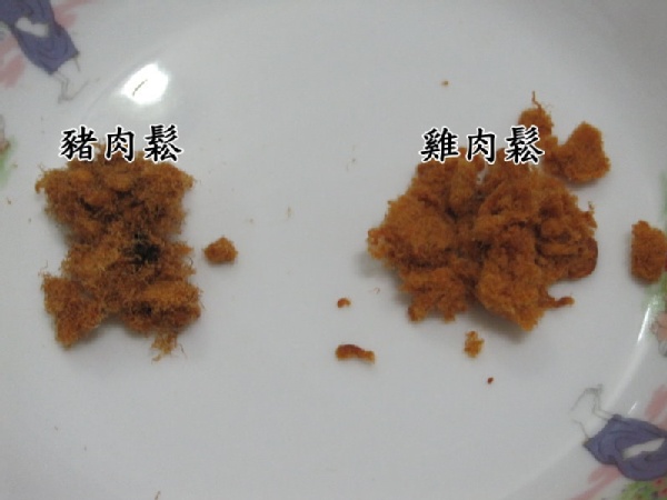 1.豬肉鬆的顏色比較深,雞肉鬆顏色比較亮。