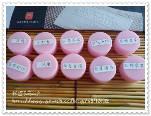而試聞品是裝在10個粉紅小盒子裡頭.每個小盒上都貼有香氣的名字~
