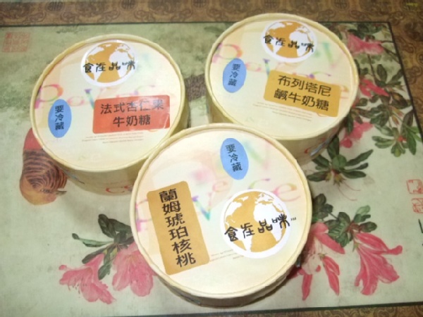 布列塔尼鹹牛奶糖是金黃色的紙包住、法式杏仁果牛奶糖是咖啡色的紙、蘭姆琥珀核桃是紅色的紙