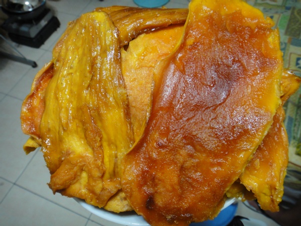 15-20斤的芒果只能烘出1斤的芒果乾,且要烘烤1天1夜,加上曬陽光1日才成,非常辛苦且用心的全手工製芒果乾,是在伯果園的在伯嫂一人烘焙!