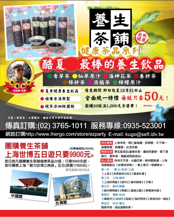 ezparty(31) 回覆 在 2010/5/14 2:31 am 發表 () 養生茶舖夏日開賣瞜!!!買養生茶就可以9900去上海世博江南五日遊!!歡迎各位主購及老主顧趕快訂購好喝的養生茶舖茶品,凡主購或顧客能湊期一團16人去上海世博江南遊,養生茶舖就送你免費遊上海世博江南五日遊。名額有限,把握機會。(即日起至6月10日止) 回覆作者