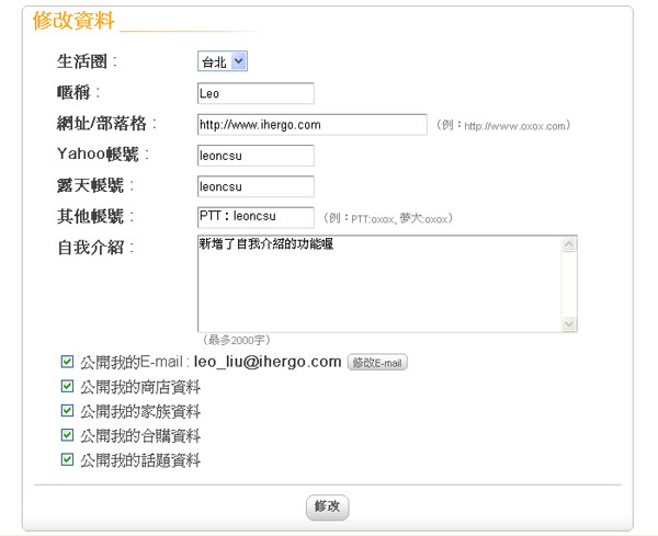 在「帳號管理」的頁面有上傳照片及修改個人資料的功能。只要瀏覽您要上傳的照片在點選「上傳」即可完成喔!在修改資料內填入您想要更新的資料點選「修改」就能完成更新。填寫Yahoo或露天帳號能讓大家知道您的拍賣評比,提高大家願意跟您合購的意願喔!新增了自我介紹的功能,可以讓大家更了解您喔。
